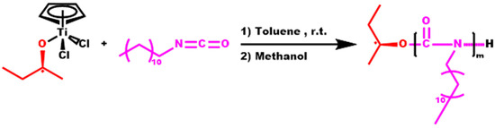 - Patten, T.E.; Novak, B.M. Living Organotitanium(IV)-Catalyzed Polymerizations of Isocyanates. J. Am. Chem. Soc. 1996, 118, 1906–1916. [Google Scholar] [CrossRef]