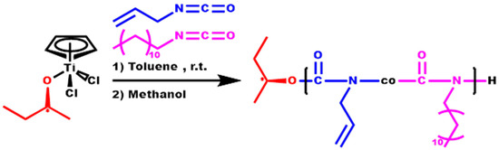 The complex [CpTiCl2(O-(S)-2-Bu)] was synthesized according to previously reported protocols [43] and used as initiator for all the polymerizations. CpTiCl3 (Aldrich Europe, Buchs, Switzerland, 97%) and (S)-2-butanol (Aldrich, 99%, St. Louis, MI, USA) were used as received for the preparation of the initiator, while triethylamine (Aldrich, 98%) and chloroform-d were dried over CaH2 and molecular sieves (Linde 4Å, Doublin, Ireland) for 24 h, respectively, and then both distilled under reduced pressure. Toluene (Fisher, ≥99.8%, Hampton, NH, USA) was dried over CaH2 overnight and then distilled. Dichloromethane (Fisher, ≥99.8%), used for the thiol-ene click reaction, was dried over molecular sieves for 20–24 h and distilled. Azobisisobutyronitrile, AIBN (98% ACROS), was purified by recrystallization twice from methanol and then vacuum-dried. Methanol (Aldrich, 98%) and 2-Phenylethanethiol (TCI, Tokyo Japan, >97%) were used as received. For the purification of allyl isocyanate, ALIC (Sigma-Aldrich, 98%, St. Louis, MI, USA), and dodecyl isocyanate, DDIC (Sigma-Aldrich, 99%), the two monomers were left under stirring for 24 h with a small amount of drying CaH2 as well as 4,4-methylene-bis-phenyl isocyanate, followed by distillation.