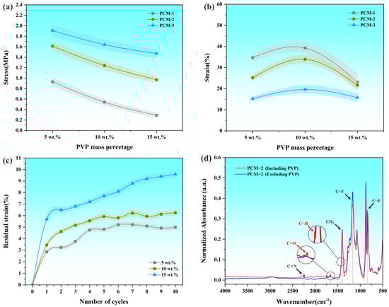 (a) Stress and (b) strain values of porous PVDF/PAN composite membranes with different PVP mass fractions, (c) residual strain of PCM-2 with 5 wt.%, 10 wt.% and 15 wt.% PVP contents, (d) Overlaid FTIR spectra of PVDF/PVP/PAN composite membrane before and after PVP dissolution.