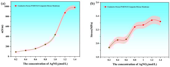 Effect of AgNO3 concentration on the electrical (a) conductivity and (b) stress of conductive porous PVDF/PAN composite fibrous membranes.
