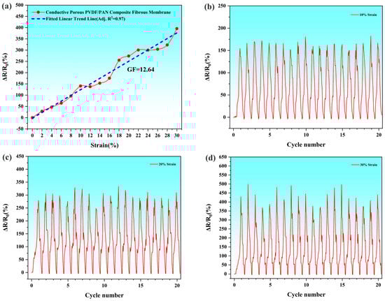 Figure 7a presents the relative resistance change (ΔR/R0) response curve of the conductive porous PVDF/PAN composite fibrous membrane. The membrane, fabricated using 1.2 mol/L AgNO3 solution, demonstrates a strain sensitivity (gauge factor) of 12.64 within the strain range of 0–30%. Building upon the established principle demonstrated by Zhao et al. [33] and Cao et al. [41], where conductive materials embedded in fibrous membranes enable effective strain sensing, our study utilizes AgNPs for their superior electrical conductivity. The metallic nature of silver nanoparticles, combined with their uniform distribution throughout the fibrous network, facilitates enhanced electron transfer efficiency and, consequently, improved sensing performance.