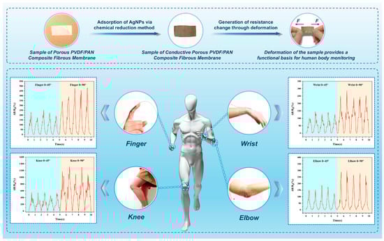 This investigation demonstrates the successful development of a conductive porous PVDF/PAN composite fibrous membrane with superior human motion detection capabilities. The membrane exhibits precise strain-dependent resistance modulation (ΔR/R0) across various joint articulations. The exceptional sensing performance stems from the synergistic combination of homogeneously distributed AgNPs across the PVDF fiber surface and the robust mechanical support provided by the PAN fiber framework. Systematic characterization of the strain-resistance relationship revealed high linearity across distinct deformation ranges, enabling accurate signal transduction and reliable motion detection. The membrane’s structural integrity, characterized by a stable conductive network and enhanced mechanical properties, establishes its viability for practical implementations in human motion monitoring systems. These findings not only validate the membrane’s functionality but also suggest broader applications in wearable electronics and human-machine interface technologies.
