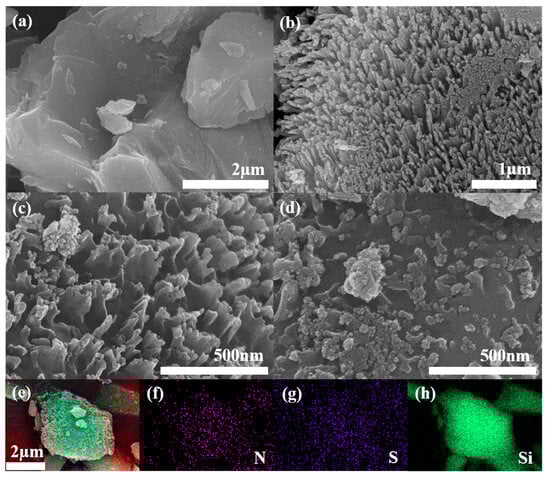 Field-emission scanning electron microscopy (FE-SEM) images of (a) micron silicon (mSi), (b) porous micron silicon (por-mSi), (c) polystyrene-sulfonate-grafted porous micron silicon (por-mSi@PSS), and (d) por-mSi@PSS anode coated with polyaniline (por-mSi@PSS/PANI) and energy-dispersive X-ray spectroscopy (EDS) elemental mapping of por-mSi@PSS@PANI for (e) full image, (f) N, (g) S, and (h) Si elements.