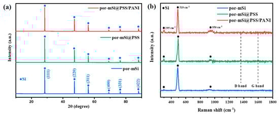 (a) X-ray diffraction (XRD) spectra and (b) Raman spectra of por-mSi, por-mSi@PSS, and por-mSi@PSS/PANI.