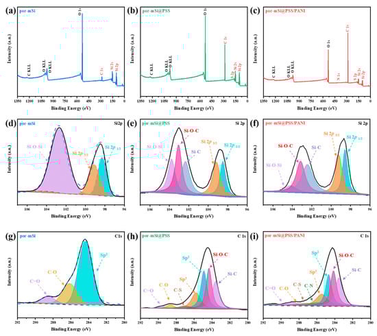 XPS was performed to characterize the surfaces of the prepared samples. The survey scans (Figure 4a–c) of por-mSi, por-mSi@PSS, and por-mSi@PSS/PANI showed clear peaks at 284, 532, and 99 eV for C 1s, O 1s, and Si 2p, respectively. After PSS pyrolysis grafting, the C 1s peak increased, as shown in (Figure 4b). In addition, the increase in the C 1s peak after the additional PANI coating (Figure 4c) suggest that abundant C species were present on the Si surface [45]. The high-resolution core-level spectrum of Si 2p confirmed the oxidation state of the Si composite. In the core-level spectra of the samples (Figure 4d–f), the Si 2p spectrum was divided into five components of Si 2p 1/2 at 98.3 eV, Si 2p 3/2 at 99.4 eV, Si–C at 102.3 eV, Si–O–C at 103.1 eV, and Si–O–Si at 103.5 eV [46,47]. During pyrolysis grafting, Si–C and Si–O–C species were formed in the por-mSi@PSS and por-mSi@PSS/PANI samples, respectively. In particular, the Si surface was significantly protected in por-mSi@PSS/PANI, as indicated by the negligible levels of the Si–O–Si peaks (Figure 4f). In contrast, the Si 2p core spectrum of por-mSi (Figure 4d) showed a dominant peak at 103.5 eV, indicating that the Si surface was more prone to oxidation. These results suggested that the formation of Si–O–C and Si–C covalent bonds improved the stability of Si. In addition, the C 1s core spectra (Figure 4h,i) of the prepared Si composite were resolved into sp2- and sp3-hybridized states of C–C bonds at 284.5 and 285.7 eV, respectively, with peaks corresponding to C–N and C–S bonds at 286.1 and 287.2 eV, respectively. In contrast, the C 1s spectrum of por-mSi predominantly showed sp2 hybridization peaks, with only C=O and C–O peaks [48]. The C peak observed in Figure 4g corresponds to impurities, commonly referred to as ‘adventitious carbon’ (AdC). It is well established that surface contamination tends to increase with longer storage times, and even storage under vacuum conditions does not completely eliminate this issue [49]. In particular, the porous nature of the por-mSi sample makes it highly susceptible to contamination from the surrounding environment due to its high specific surface area. On the other hand, Figure 4h,i show a significant reduction in AdC signals, and Si-C and Si-O-C peaks were observed, indicating the presence of the PSS grafting layer. Since the thickness of the PSS layer (4–5 nm) is not thick enough to interfere with the XPS analysis of the underlying Si surface, it is reasonable to interpret that the formation of AdC is suppressed after grafting.
