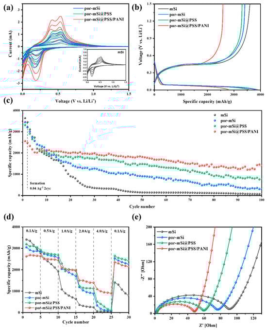 (a) Cyclic voltammetry of prepared anodes from 1st to 5th cycle. (b) Galvanostatic charge–discharge profiles for the first cycles of mSi, por-mSi, por-mSi@PSS, and por-mSi@PSS/PANI at a current density of 0.04 A g−1. (c) Cycling performance of mSi, por-mSi, por-mSi@PSS, and por-mSi@PSS/PANI at 0.1 A g−1. (d) Rate capability of prepared samples. (e) Nyquist plot of mSi, por-mSi, and por-mSi@PSS/PANI samples before cycling.