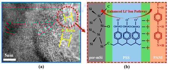 Schematic of Li+ ion storage mechanism of por-mSi@PSS/PANI. (a) Si and styrene C fragments formed a solid Si–C/Si–O–C bond (PSS layer of 4–5 nm shown in HR-TEM images), and (b) a conductive polymer layer attached by electrostatic attraction contributed to the improved transfer of Li+ ions and electrons.