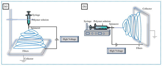 Schematic of the electrospinning setups: (a) vertical and (b) horizontal setups (adapted with permission from [7], Copyright © 2010 Elsevier Inc.).
