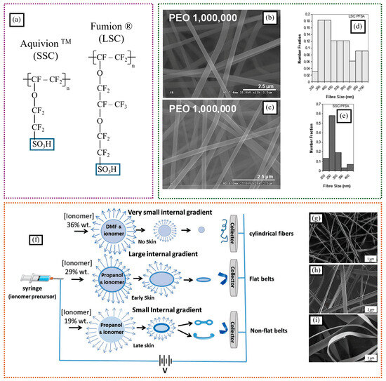 (a) Structures of LSC and SSC–PFSA ionomers. SEM images of (b) Fumion® and (c) AquivionTM nanofiber mats made from 20% dispersion in DMAc with 1.5% and 1% (m/v) PEO (M.W.—1,000,000), respectively. Fiber size distribution for the same fibers: (d) Fumion® and (e) AquivionTM (adapted with permission from reference [43], Copyright © 2012 Wiley Periodicals, Inc.) (f) Schematic for the preparation of ionomer fibers with different solvent and ionomer contents. HR-SEM micrographs of anion-conducting nanofibers: (g) cylindrical (36 weight% FAA-3, in DMF), (h) flat ribbon-like (19 weight% FAA-3, in propanol), and (i) flat ribbon-like (29 weight% FAA-3, in propanol) (adapted with permission from reference [44], © 2019 WILEY-VCH Verlag GmbH & Co. KGaA, Weinheim).