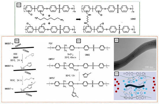 (a) Schematic depicting the reaction of chloromethylated polysulfone (CMPSF) with diamine (hexamethylenediamine) towards cross-linked polysulfone (adapted with permission from reference [49], Copyright © 2013 American Chemical Society). Reaction schematic of (b) imidazolium-functionalized MWCNTs and (c) an imidazolium functionalized polysulfone (IMPSf). (d) TEM image of a MWCNT-embedded nanofiber. (e) Possible mechanism of co-electrospun FMWCNT/IMPSf composite membrane for hydroxide transport (adapted with permission from reference [51], © 2018 Hydrogen Energy Publications LLC.).