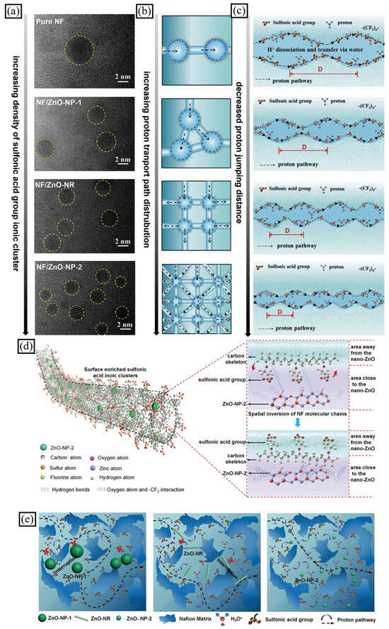 The nano-physical distribution and geometry of sulfonic acid ionic clusters were investigated. (a) High-resolution TEM image. Graphical representation of (b) path distribution and (c) jump trajectory of proton transport in sulfonic acid ionic clusters (sulfonic acid ionic clusters are represented by yellow circles). (d) Chemical structure and molecular model of NF/ZnO nanofibers during intermolecular electrostatic interactions and hydrogen bonding for nano-ZnO and -CF2 groups. (e) Schematic for nano-ZnO morphology and size effects on the pathway of proton transport within the fiber region (adapted with permission from [60], Copyright © 2020 WILEY-VCH Verlag GmbH & Co. KGaA, Weinheim.).