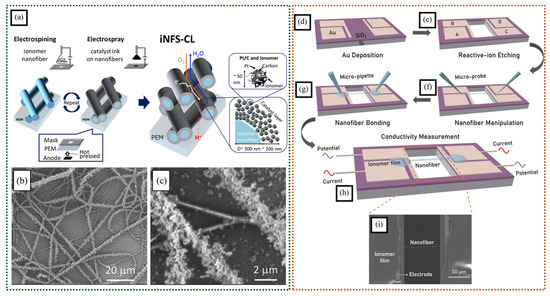 (a) Fabrication schematic and structure of ionomer nanofiber scaffolding catalyst layer. (b,c) SEM figures of iNFS-CL (one cycle) (adapted with permission from [61], © 2020 Elsevier B.V.). The process of fabricating a micro-electrode with a single ionomer nanofiber; (d) deposition of Au on SiO2; (e) etching of the substrate; (f) immobilization of the nanofiber on a micro-electrode; (g) attachment of the nanofiber and micro-electrode using ionomer solution droplets; (h) drying of the ionomer droplets; (i) SEM image of the ionomeric nanofiber attached to microelectrode via ionomer solution droplets (adapted with permission from [62], © 2022 Elsevier Ltd.).