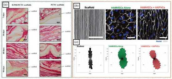 (a) Histological analysis of D-PHI/PCNU and PCNU scaffolds, stained with Picrosirius red, revealed tissue integration over time. The scaffolds, stained pale yellow, were found to integrate with surrounding tissue, stained dark yellow, and collagen fibers, stained red (adapted with permission from [75], Copyright © 2019 Acta Materialia Inc.). (b) These SEM images visualize the three-dimensional topography of the scaffold. Immunofluorescent staining techniques were employed to examine the morphology of the HAMVECs. Scale = 50 μm. (c) Rose plots were used to illustrate the average distribution and orientation of the cells (adapted with permission from [76], Copyright © 2023 Acta Materialia Inc.).