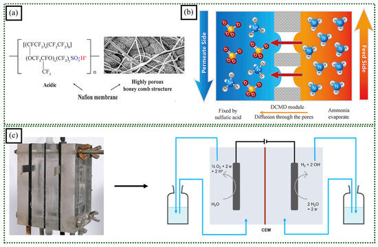 (a) Chemical structure and SEM image of highly porous honeycomb-structured Nafion/PVDF membrane (colored segment representing the sulfonic acid of the ionomer). (b) Schematic diagram of the ammonia recovery process via DCMD (adapted with permission from [82], Copyright © 2019 Elsevier B.V.). (c) Lab-scale electrochemical setup made from plexiglass with two compartments separated by CEM (adapted with permission from [85], Copyright © 2022 Elsevier B.V.).