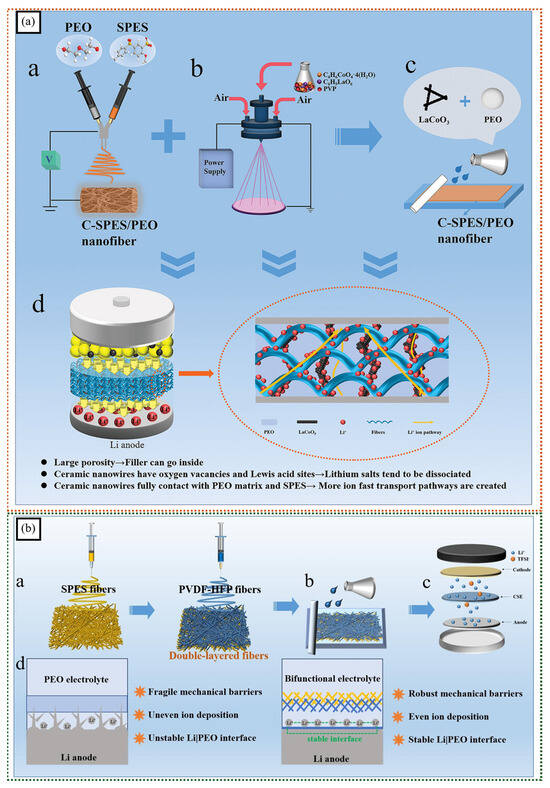 (a) A schematic of fabrication of (a) 3D crimped nanofiber membranes, (b) LaCoO3 nanowires, and (c) C-SPES-PEO-LaCoO3 composite solid electrolytes. (d) Promotion effect of C-SPES-PEO-LaCoO3 electrolyte on lithium ion (adapted with permission from [98], copyright © 2023 Wiley-VCH GmbH). (b) Schematic of the preparation of (a) double-layer SPES-PVDF-HFP nanofiber membrane, (b) composite solid electrolyte, and (c) all-solid-state lithium battery. (d) Working principle of electrolyte (adapted with permission from [99], Copyright © 2024 Elsevier B.V.).