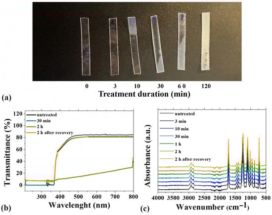 (a) Picture of untreated and treated samples, (b) UV-VS spectra of untreated and treated aligners, (c) ATR-FTIR spectra of the orthodontic aligners.