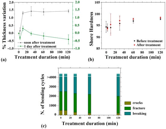 The thickness of the aligner material was measured, and the percentage variation is shown in Figure 3a. A slight increase in thickness was observed after the treatment, and values returned to the initial values after recovery at room temperature overnight.