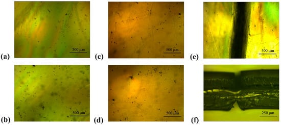 Optical microscope images of the samples (a) untreated; (b) 120 min-treated in hot water; (c) untreated, after 500 bending cycles; (d) 120 min-treated in hot water after 200 bending cycles; fracture point of the untreated sample (e) above view and (f) side view.