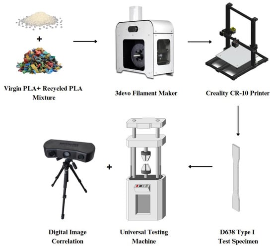 In this study, PLA 3D prints were collected, shredded, and mixed with virgin PL pellets, then extruded into new filament spools for subsequent printing. All filaments and test specimens were produced using a desktop-sized single-screw filament extruder by 3devo (Utrecht, The Netherlands) and an FDM 3D printer by Creality (Shenzhen, China). The specimens, with compositions ranging from 100% virgin PLA to 100% recycled PLA, underwent tensile testing in conjunction with DIC. Additionally, the properties from all composition variations were compared and benchmarked against that of a commercially available PLA filament from Wanhao (Zhejiang, China). Figure 1 provides a schematic overview of the experimental procedure and the steps involved in this study.