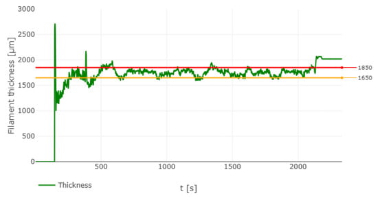 In preparation for the filament extrusion process, key parameters were configured in the extruder, including preheating the screw and setting the dimensions of the spool. Critical measurements, such as the spool’s width and its diameter when full and empty, were input into the system to ensure the spool mechanism maintained appropriate tension during winding. These measurements were obtained using a vernier caliper. The desired filament diameter was set to 1.74 mm, closely matching that of commercially available filaments. Once all parameters were configured and the screw reached the required preheat temperature, the extrusion process commenced. As the filament exited the nozzle and passed between cooling fans, it was monitored by an optical sensor before traveling through two pulleys, which controlled its thickness by adjusting their relative speeds. Figure 2c provides a labeled illustration of the nozzle, fans, optical sensor, and puller wheels. The filament was then wound onto the spool for subsequent use in 3D printing. The 3devo extruder offers live data-logging capabilities via its DevoVision software v2.0. The software continuously logs critical parameters such as heater temperatures, extruder RPM, filament diameter, fan speed, and total filament length. These logs are saved after each extrusion session for further analysis. Figure 2d shows the setup used for live data logging. Additionally, Figure 3 illustrates the filament thickness of a spool composed of 50% virgin PLA and 50% recycled PLA, with lower and upper bounds set at 1.65 mm and 1.85 mm, respectively.