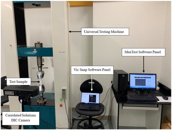After 3D printing two specimens for each percentage composition, the samples were prepared for simultaneous tensile testing and DIC. The specimens were first spray-painted white using Asmaco high-gloss spray paint. Once dried, black speckle patterns were manually applied across the surface of each specimen using a Pilot Sca-Tm-B black marker. Figure 4b displays all 3D-printed samples ready for DIC testing. Tensile testing was conducted using a servo motor-driven universal testing machine (UTM) from Laryee Technology (Beijing, China), with the uniaxial tensile test parameters controlled through MaxTest software also by Laryee Technology. For the DIC tests, a Correlated Solutions (South Carolina, USA) system was used, with VicSnap software for image acquisition and Vic3D software for image correlation and post-processing also by Correlated Solutions (South Carolina, USA). Each specimen was securely gripped in the UTM to prevent slippage during testing. The DIC camera was adjusted for optimal focus, brightness, and polarizing filter settings, followed by calibration. Once the setup was complete, the tensile test commenced, and the DIC camera simultaneously captured images at 4 s intervals, resulting in a total of 50 images. The tensile testing machine operated at a constant crosshead speed of 1 mm/minute. Figure 5 illustrates the overall setup for this testing procedure. This process was repeated for all specimens across the different composition percentages. Data were recorded and saved for further analysis, including extracting the desired mechanical properties. The images captured by Vic Snap were imported into Vic3D for correlation, while the text files from the MaxTest software were imported into MATLAB R2023a for analysis and plotting.