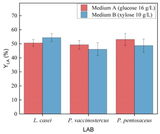 During the preliminary phase of this study, the maximum YLA produced by the LAB was evaluated, using glucose and xylose as the starting sugars (Figure 1). In Medium A, all three microbial strains consumed the available glucose, with P. pentosaceus reaching a maximum YLA of 0.53 g LAp /g TCc, given a theoretical maximum YLA of 1.0 g LAp/g TCc. The YLA among the three strains showed no statistically significant differences (p-value = 0.132), and by the end of fermentation, the pH stabilized around 4. Interestingly, all microbial strains fully consumed the available xylose in medium B (10 g/L), with no statistically significant differences in YLA compared to medium A (p-value = 0.297). The highest YLA was observed for L. casei (0.54 g LAp/g TCc), which was not significantly higher than that of P. vaccinostercus (0.46 g LAp/g TCc) and P. pentosaceus (0.48 g LAp/g TCc). All three YLA, however, were found to be very close to the theoretical maximum yield of xylose (0.6 g LAp/g TCc). All the LAB produced low concentrations of AA during the fermentation, which could be explained by the use of the PK-P, in accordance with the literature that describes the three strains as heterofermentative [].