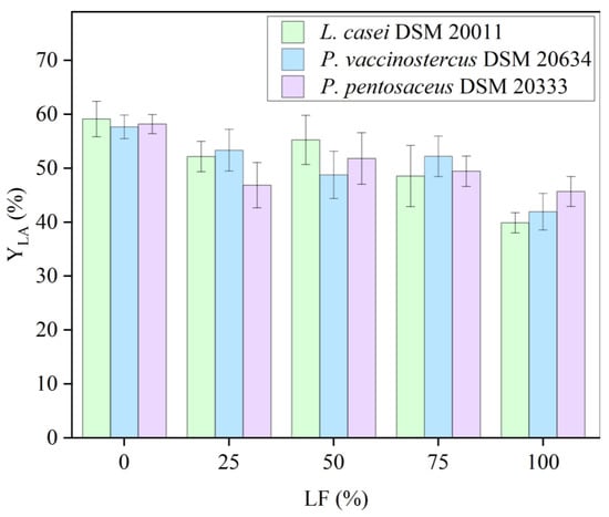 Despite this, it is noteworthy that no statistically significant differences in YLA were observed among the use of 25% LF, 50% LF, and 75% LF in all three microorganisms (p-value = 0.91, p-value = 0.99, and p-value = 0.98, respectively). Therefore, up to 75% LF can be used in the culture medium, utilizing a fraction derived from the steam explosion process that is rich in pentoses and still considered a by-product. Furthermore, the YLA values were slightly higher compared to those achieved with complex media (media A and B), highlighting the potential of low-cost, natural microbial substrates for efficient LA production. Full results of the two-way ANOVA and the Tukey–Kramer test are shown in the Supplementary Materials.