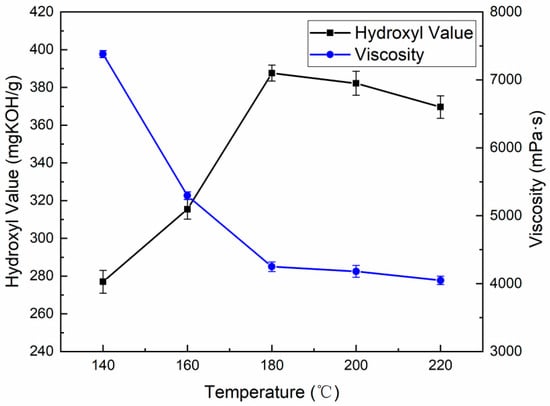 In this experiment, EG and MEA were used as the alcoholysis agent in a mass ratio of 6:4; the solid–liquid ratio was 1:1.5 and the PN catalyst dosage was 0.08% (based on the total mass of alcoholysis agent and WPUF). When the degradation time was 3 h, the reaction temperatures of 140, 160, 180, 200, and 220 °C were used as experimental factors. The hydroxyl values and viscosities of the recovered polyols at different reaction temperatures are shown in Figure 3.