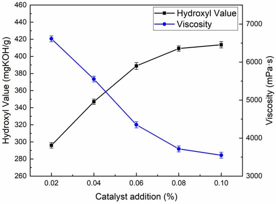 Catalysts play an important role in the degradation of waste polyurethanes, and its dosage significantly affects the degradation effect, determines the usability of the degradation product of recycled polyols, and also affects the cost of industrial applications []. In this experiment, EG and MEA were used as alcohololytics in the mass ratio of 6:4 with a solid–liquid ratio of 1:1.5, and the reaction was carried out at 180 °C for 3 h. The recovered polyols obtained by using the amount of metal-free ionic PN catalysts of 0.02%, 0.04%, 0.06%, 0.08%, and 0.10% (based on the total mass of the alcohololytics and the WPUF) were, in the experimental factors, numbered in order as follows: RP-0.02, RP-0.04, RP-0.06, RP-0.08, and RP-0.10, and their hydroxyl values and viscosities are shown in Figure 4.