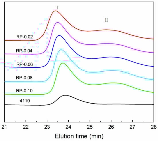 The GPC test results of the recycled polyol and polyether 4110 are shown in Figure 5 and Table 2. The polyurethane chain is decomposed into low-molecular-weight chain segments under the action of the alcohololytic agent and PN catalyst. Peak I in Figure 5 is attributed to the recycled polyol, whose elution time is similar to that of polyether polyol 4110, which is an oligomer. Peak II represents the small molecule aromatic by-products formed when the hard segments of polyurethanes are replaced by alcoholysis agents during the transesterification process []. The number of the average molecular weight (Mn) of the degradation products of recovered polyols ranged from 4804 to 2465, which gradually decreased with the increase in PN catalyst dosage, and the elution time was gradually prolonged. When the catalyst dosage exceeded 0.08%, the recovered polyol Mn and PDI did not change much.