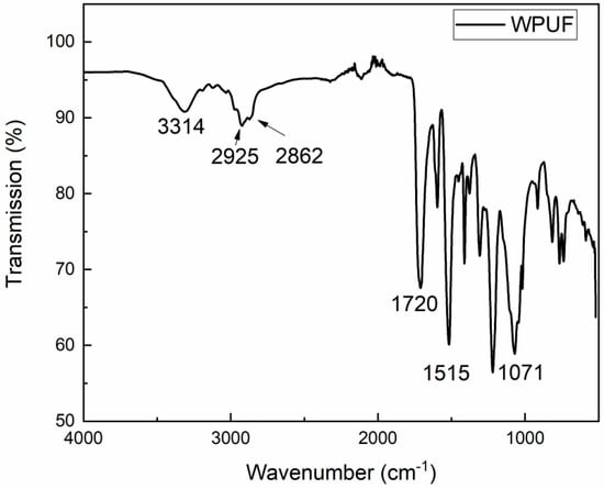 The infrared spectrum of used polyurethane rigid foam WPUF is shown in Figure 6. The spectrum shows some main peaks of WPUF: C-O stretching vibration peak (1071 cm−1), -Ar (1515 cm−1), -NHCO- (amide I band, 1720 cm−1), CH2 stretching vibration peaks (about 2925 cm−1 and 2862 cm−1), and -NH stretching vibration peaks (ca. 3314 cm−1) []. It can be seen that WPUF is a polyether-type polyurethane.