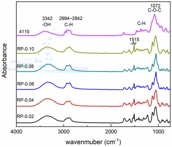 The IR spectra of the recycled polyurethane foams prepared from the recycled polyol RP-0.08 obtained at 0.08% PN dosage with different substitution rates are shown in Figure 10. All the foam samples showed similar absorption vibration peaks. The broad peak near 3312 cm−1 is characteristic of the stretching vibration signal of N-H, and the absorption peak at 1709 cm−1 is that of -NHC=O []. The stretching vibration peak of -C-H is near 2925 cm−1 [], and there is a strong absorption peak at 1223 cm−1 attributed to the C-N in the carbamate bonding stretching vibration; 1400–1600 cm−1 is the vibrational characteristic peak of the aromatic skeleton. The red spectrogram of the RPU-0 sample has a very small peak at 2270 cm−1, which indicates that the polyol basically reacts completely with the isocyanate, and there is almost no residual -N=C=O. As the substitution rate of the recycled polyol increases, the absorption peak of -N=C=O gradually strengthens, which indicates that the reactivity of the recycled polyol is weaker than that of polyether 4110, and free isocyanate exists in the recycled polyurethane foam. The peak at 1072 cm−1 is attributed to the stretching vibration of the ether bond []. The peak at 1043 cm−1 corresponds to the characteristic absorption peak of -C-O- in the urethane ester []. It indicates that the presence of urea groups in the synthesized polyurethanes is conducive to improve the compressive strength of the recycled polyurethanes. The above analysis shows that the recycled polyurethane materials were successfully prepared by replacing polyether polyol 4110 with different amounts of recycled polyol.
