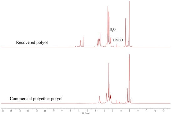 The recycled polyol RP−0.08 and commercial polyether 4110 were characterized by NMR hydrogen spectroscopy, and the spectra are shown in Figure 8. The proton peaks at 1.03−1.46 ppm are for methyl groups, and the absorption peaks at 3.32−3.64 ppm are attributed to methylene groups affected by hydroxyl groups and methylene groups attached to ether bonds []. The chemical shift at around 3.51−4.50 ppm is the proton peak of the terminal hydroxyl group. The proton peak at 6.50−6.86 ppm is the absorption of hydrogen atoms on the benzene ring [], which originates from the hard segment of the polyurethane. The comparison shows that the 1H NMR spectra of the degradation product and the commercial polyether polyol are similar, which proves that the regenerated polyether polyol was successfully prepared.