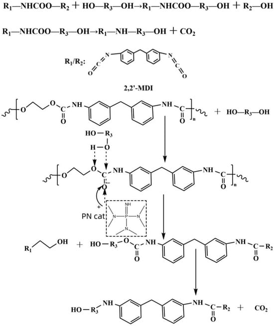 Polyurethanes consist of carbamate links, which are polymeric polymers formed by the polyaddition reaction of diisocyanates and diols or polyols [,,]. The mechanism of degradation of waste polyurethane involves several chemical reaction steps that work together to achieve the degradation of polyurethane. The principle of the PN catalyst to catalyze polyurethane is a relatively complex process. Nitrogen atoms and phosphorus atoms in the PN catalyst act as nucleophilic reagents, and nucleophilic addition and elimination reactions occur. The PN catalyst has strong alkalinity and high nucleophilicity, making it an effective catalyst. Under the action of the PN catalyst, carbonyl carbon atoms in a carbamate bond are attacked by the nucleophile, and a nucleophilic addition reaction occurs. The first is the activation of the PN catalyst. The catalyst forms coordination bonds with the carbonyl group (C=O) in polyurethane through the lone pair of electrons on its nitrogen atom. The coordination between the PN catalyst and the carbonyl group reduces the electron density of the carbonyl group and makes it more vulnerable to nucleophilic attack, thus activating the carbonyl group. Because the activated carbonyl group is more susceptible to attack by the alcohols of the nucleophile alcohololysis agent, this nucleophilic attack can lead to the transfer of electrons and the breaking and rearrangement of urethane bonds []. During the nucleophilic attack, a transition-state intermediate is formed with the phosphorus–nitrogen bond as the active center, in which the catalyst interacts with both the broken and unbroken parts of the carbonyl group of the carbamate bond. Subsequently, by eliminating the reaction, resulting in the break of the carbamate bond, the catalyst forms a new chemical bond with the group of the broken carbamate bond, forming the product of the hydroxyl group as the end group of the regenerated polyether polyol. The degradation reaction mechanism of polyurethane degraded by the PN catalyst is shown in Figure 9, in which R3 is mixed alcohol EG and MEA [,,,].