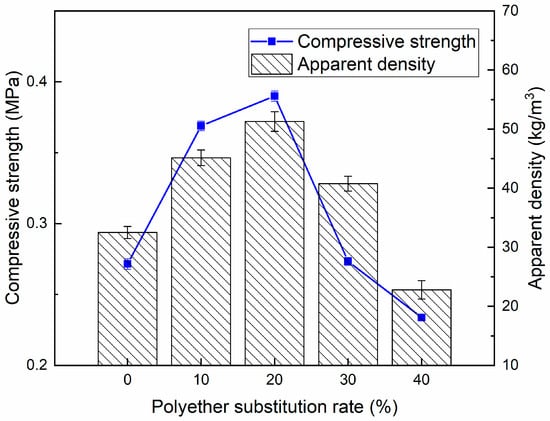 The compressive strength and apparent density of the recycled polyurethane foams prepared from recycled polyol RP-0.08 at different substitution rates are shown in Figure 11. The compressive strength of the recycled polyurethane material first increased and then decreased with the increase in substitution rate, reaching a maximum value of 0.390 MPa at a 20% substitution rate, which was 43.38% higher than that of pure petroleum-based polyurethane with a 0% substitution rate (0.272 MPa). This may be attributed to the fuller reaction between the blended polyol and the isocyanate when the substitution rate is small and the introduction of a large amount of aromatic structures derived from the isocyanate into the recycled polyurethane foam in the recycled polyol, with an increase in the content of hard segments, which leads to an improvement in the compression properties []. Recycled polyurethane-based polyols have a higher functionality than conventional petroleum-based polyols, which leads to higher crosslink density. The structure of recycled polyurethane foams has short and difficult to move hard segments, which favors compression strength. The higher the recycled polyol content, the more isocyanate groups are required for the reaction, which leads to higher crosslinking density and the generation of more urea groups, and possibly also to stronger diureido groups, thus increasing the content of hard segments in the recycled polyurethane matrix, which is consistent with the IR spectroscopy results. This formation of high hard chain segments and high crosslink density in the polymer molecule determines the compressive strength of the polyurethane. The increase in crosslink density is also the reason why the apparent density of recycled polyurethane foam increases first with the increase in substitution rate [,]; however, when the substitution rate is too high, the reactivity of recycled polyol is weaker than that of polyether 4110, and the reaction between the polyol and the isocyanate becomes less and less, and the formation of crosslinked mesh of the polyurethane is not sufficient []. At the same time, due to the fact that the complex structure of recycled polyol also leads to the uneven size and structure of the foam pores, the support of the foam internal pore wall is reduced, and the multiple factors lead to a gradual decrease in its compressive strength and apparent density with the excessive increase in substitution rate. Apparent density is an important performance index of rigid polyurethane foam. Rigid polyurethane foam can be used in the fields of refrigerators, underground direct buried pipes, composite panels, and core materials for construction, etc. Different applications require different polyurethane densities []. For example, the apparent density of recycled polyurethane with a substitution rate of 10–30% is greater than 30 kg/cm3 and up to 51.27 kg/cm3.