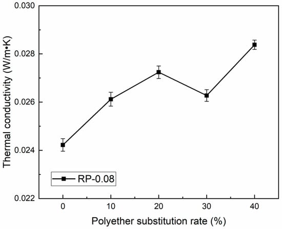 Polyurethane rigid foams are commonly used in insulation applications for which thermal conductivity (λ) is a critical property. The results of thermal conductivity measurements of recycled polyurethane prepared with different substitution rates of recycled polyol RP-0.08 are shown in Figure 12. The thermal conductivity is related to the apparent density of the foam and the thermal conductivity of the gas used as a blowing agent []. Although the whole foam contains only a small portion of the polyurethane matrix, denser foams tend to have higher thermal conductivity because their λ values are much higher than those of the blowing agent []. Therefore, within a certain range, the thermal conductivity of polyurethane foam gradually increases with the increase in the substitution rate of recycled polyol, and the thermal insulation decreases. When the substitution rate of recovered polyol is 20%, the thermal conductivity increases from 0.0242 W/m·K to 0.0272 W/m·K, which is an increase of 12.40%. When the substitution rate is 30%, the thermal insulation performance of the foam is improved due to the reduction in its apparent density, but the thermal conductivity is also related to the internal structure of the material. When the substitution rate continues to increase, the small density tends to make the tiny window pore structure inside the polyurethane become larger or connected, which leads to the enhancement of the radiation effect of the air between the holes and the convection inside the holes, resulting in the increase in the coefficient of the thermal conductivity of the polyurethane material [].