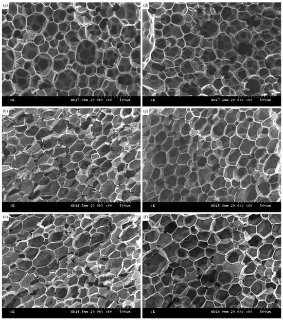 SEM images of RPU prepared with different recycled polyols at a substitution rate of 20%. Types of polyols used: (a) Polyether 4110 (b) RP-0.02 (c) RP-0.04 (d) RP-0.06 (e) RP-0.08 (f) RP-0.10.