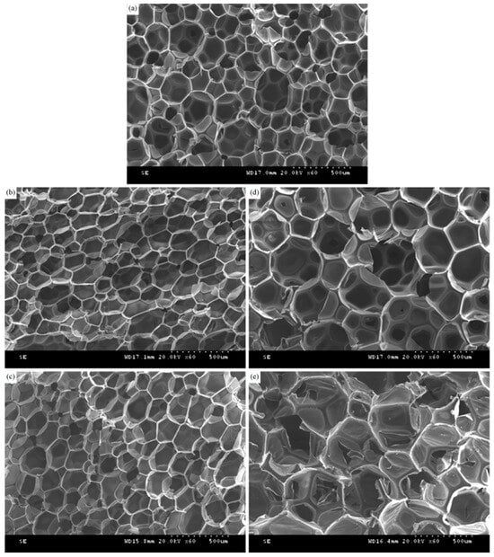 The recycled polyurethane slice samples of different components were selected to ensure that the surface of the samples was clean and free of oil, and the samples were placed on the sample table of the PVD equipment. The PVD device was started, vacuum pumping was performed first, the gold was installed on the evaporation source, the evaporation source was started, and the gold was evaporated and deposited on the sample surface. During deposition, the sample table was continuously rotated to ensure a uniform distribution of the coating. The deposition process was monitored in real time to ensure the uniformity and quality of the coating. The magnification was 20.0 kv × 60, and the pore morphology and skeleton structure of each sample were observed.