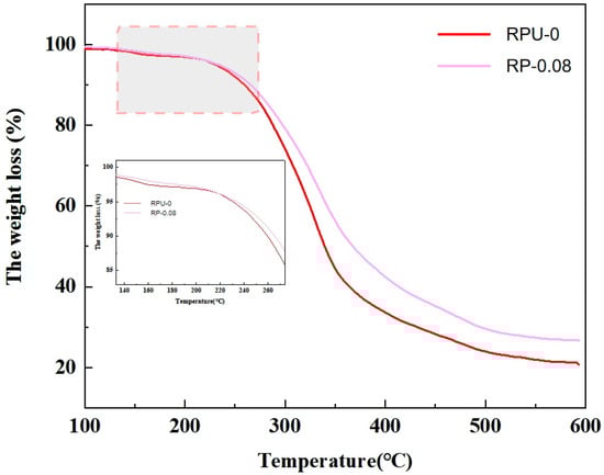 Combining the above conditions of density, compressive strength, and other conditions for the elimination of the prepared foam selection, it was determined that the PN catalyst addition dosage of 0.08% for the better performance of the RP-0.08 foam body and pure samples of RPU-0 thermogravimetric analysis was carried out as shown in Figure 17. From the figure, it can be seen that the phosphorus and nitrogen elements of the PN catalyst have obvious effects on the thermal weight loss analysis curve of polyurethane, which are mainly reflected in four aspects, such as the increase in decomposition temperature, the decrease in decomposition rate, the enhancement of thermal stability, and the change in the morphology of the thermal weight loss curve. The heat weight loss of the two different ratios of foams can be divided into three stages: the first stage is 100–200 °C, where the volatilization of free and bound water in the foam leads to the weight loss of the foam; the second stage is 200–390 °C, which is the isocyanate in the polyurethane linkage with the hard section of the polyurethane break; and the third stage is 390–590 °C, which is the polyether in the polyurethane tip of the polyurethane soft satin break. The substantial weight loss temperature of the foams prepared in two ratios is around 230 °C, and the decomposition stops around 590 °C. The fastest weight loss temperature of RPU-0 is around 327 °C, while the fastest weight loss temperature of RP-0.08 is around 348 °C. It can be clearly seen that, in the area of the local zoomed-in picture, the weight loss of RP-0.08 is obviously more rapid than that of RP-0.08, which suggests that the phosphorus of PN catalyst nitrogen in polyurethane, which is influenced by the elements phosphorus and nitrogen, undergoes a series of complex chemical changes at high temperatures. These changes include the oxidation of the phosphorus element and the nitrogenization of the nitrogen element or participation in the formation of the carbon layer. These chemical changes work together to affect the thermal decomposition process of polyurethane, thus affecting its heat loss curve and forming compounds with high thermal stability, which can slow down the thermal decomposition process of polyurethane. In addition to the above chemical changes, phosphorus and nitrogen elements may also cause changes in the physical structure of polyurethane. As a crosslinking point or reinforcing agent, phosphorus and nitrogen elements are able to form a crosslinking structure and improve the crosslinking density and mechanical strength of polyurethane. These changes in physical structure may also have an effect on the heat loss curve of polyurethane, resulting in a lower rate of the decomposition of polyurethane. This makes it more stable and less likely to decompose. In addition, phosphorus and nitrogen elements may slow down the thermal decomposition process by forming a carbon layer, further reducing the decomposition rate. After the introduction of phosphorus and nitrogen elements, the heat loss curve of polyurethane may undergo morphological changes. It can be seen that the slope of the curve may become flatter, indicating a slower decomposition process; phosphorus and nitrogen elements can significantly improve the thermal stability of polyurethane. Due to the increase in decomposition temperature and the decrease in decomposition rate, the polyurethane can only undergo significant thermal decomposition at higher temperatures, thus exhibiting better thermal stability, which improves the quality of the recycled product and extends its service life. Therefore, the chemical stability of the foam prepared by RP-0.08 is greater than that of RPU-0; thus, it can be shown that the foam prepared by RP-0.08 has good thermal stability and is more stable than RPU-0 [].