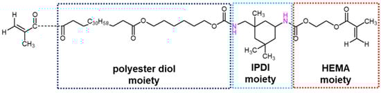 Priplast 1838, which is a polyester polyol, was provided from Cargill Bioindustrial (Gouda, The Netherlands). Dibutyltin dilaurate (DBTDL) and phenothiazine (PTZ) were purchased from Sigma-Aldrich (Poznań, Poland). 2-hydroxyethylmethacrylate (97%) (HEMA) and isophorone diisocyanate (98%) (IPDI) were purchased from Merck KGaA (Darmstadt, Germany). A Photoinitiator Omnirad 2022 was purchased from IGM Resins (Waalwijk, The Netherlands). Dichloromethane (DCM), ethanol and ethyl acetate (EtOAc) were purchased from Chempur (Piekary Śląskie, Poland). Hydrochloric acid (HCl) and the murine fibroblast cell line L929, along with all cell culture reagents, were obtained from Sigma-Aldrich (Poznań, Poland). HEMA was utilized following distillation under reduced pressure, while all other reagents were employed without further purification. PhotoBioCure® difunctional monomer of Mn = 7000 g/mol was provided by Poltiss sp. z o.o. (Szczecin, Poland) and used as a reference material.