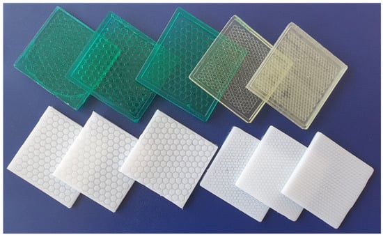 The practical possibilities of producing meshes using the open mold casting technique, followed by UV light curing of the castings, were investigated according to the following process: (i) development of a positive matrix design representing both the final shape of the mesh and additional elements needed to produce negative molds from this matrix; (ii) creation of a negative mold (or multiple molds), i.e., a production mold, using the positive matrix (Figure 2). In a flexible silicone mold, which was made using a positive matrix prepared with SLA-LCD 3D printing technology from designated photocurable rigid resin, tests were conducted at 23 °C using difunctional monomers to produce thin meshes with a mesh size up to 4 mm in a hexagonal configuration, followed by cross-linking under UV light (λmax of 385 nm and radiation intensity: 20 mW/cm2).