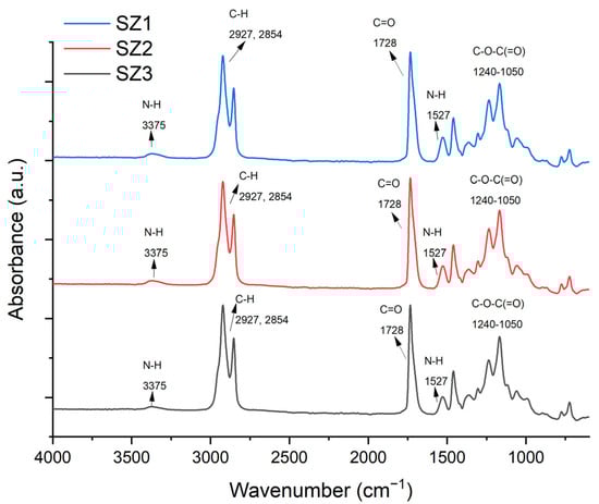 FT-IR measurements confirmed that the chemical structures of the synthesized macromonomers were consistent with the expected reaction mechanism. All spectra obtained were similar, indicating that macromonomers had the same chemical structure. The representative FT-IR spectra of the SK1_Sn material are shown in Figure 3. The absorbance bands at 3375 cm−1 and 1527 cm−1 correspond to N-H stretching vibrations in urethane groups [41]. The band at 1643 cm−1 represents C=C stretching vibrations from HEMA coupling [42]. Bands at 2927 cm−1 and 2854 cm−1 correspond to C-H stretching in -CH2 and -CH3 groups [43]. The C=O stretching band at around 1728 cm−1 in ester bonds of the polyester polyol [44]. The 1460 cm−1 band corresponds to -C-C- and R-CH2-CH3 in rings, while the 1369 cm−1 band represents C-H rocking vibrations in fatty acid chains [45]. Bands at 1302 cm−1 and 1050 cm−1 correspond to RCOOR’ in esters [46], while bands at 1240 cm−1 and 1168 cm−1 represent -C-O- and -C-O-C(=O) stretching vibrations, respectively [47].
