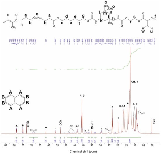The nuclear magnetic resonance (NMR) spectra of difunctional monomers was recorded on a Bruker DPX HD-400 MHz instrument (Billerica, MA, USA) equipped with a 5 mm Z-gradient broadband decoupling inverse probe at 25 °C. Approximately 20 mg of each monomer was dissolved in 0.7 mL of CDCl3-d, with naphthalene serving as an internal standard.
