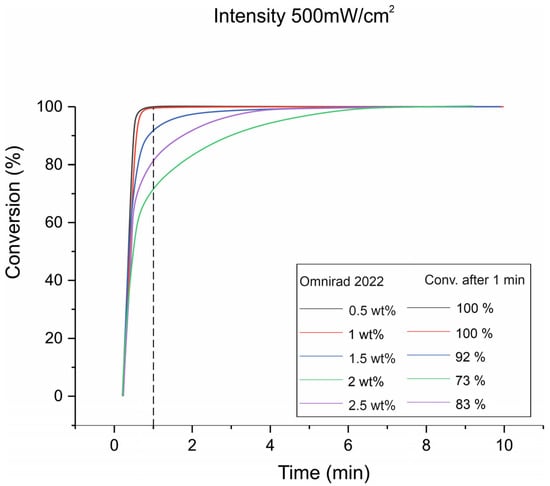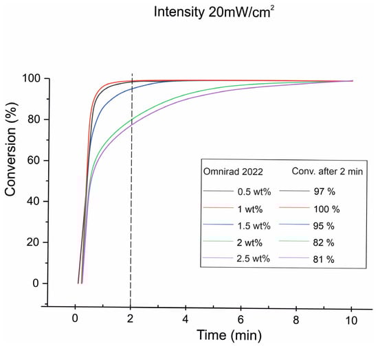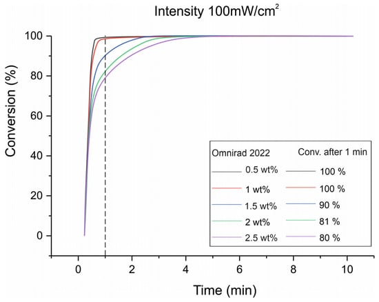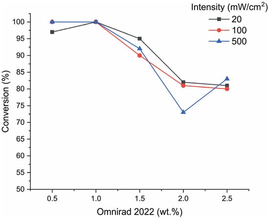 The measurements were conducted across the entire wavelength spectrum (without using filters). For all compositions, the peak maximum was observed after approximately 18 s. The calculated degree of conversion indicated that a concentration of 1 wt% of the photoinitiator was the most effective at reaching 100% conversion, irrespective of the irradiation intensity. It can be seen in Figure 9 that conversion percentage was decreased with increasing concentration of a photoinitiator. The phenomenon can be ascribed to several factors. Excessive amounts of photoinitiators cause the inner filter effect, where excessive light absorption near the surface reduces penetration into deeper layers, limiting polymerization [53,54]. Additionally, higher concentrations generate more reactive species, increasing bimolecular termination reactions, which reduce the number of radicals available for propagation. This imbalance, along with potential side reactions and system saturation, disrupts the polymerization process, leading to lower monomer-to-polymer conversion efficiency [55,56,57]. An analysis of the effect of light intensity determines that the lower conversion efficiency was observed at higher light intensities. It can be due to the overgeneration of reactive species, leading to increased termination reactions. Additionally, excessive light intensity can cause thermal effects, photoinitiator degradation, and oxygen inhibition, all of which disrupt the polymerization process [58].
