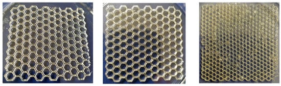 The various designs for positive matrices were prepared, incorporating wall tapering and various mesh sizes (up to 4 mm). Several experimental positive matrices were produced from UV-curable reactive resin using the SLA (LCD variant) technique. Compared to FDM 3D printing, the applied technology for creating positive matrices allows for prints (matrices) with better detail and higher surface density. Experimental production molds were made from these matrices, and trial mesh castings were created from the material that showed the best mechanical properties within SK series and with PhotoBioCure®. The mesh manufacturing was carried out at 23 °C. The obtained results, mostly correctly formed meshes, allow the conclusion that the adopted technological and tooling concept is suitable for forming this type of product. The examples of meshes formed using molds prepared from matrices made with SLA technology are shown in Figure 9. The developed procedure allows the final product to be easily and quickly cast from a reactive macromer in an open, flexible rubber mold using the UV curing technique, followed by product demolding. The production mold is reusable multiple times, having been checked after each molding cycle.