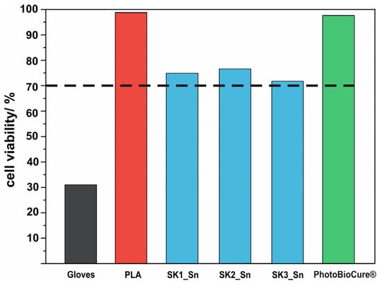 We assessed materials cytotoxicity in accordance with ISO 10993-5 to determine their suitability for biomedical applications. The cell viability results for L929 mouse fibroblasts exposed to material extracts for 24 h are shown in Figure 10. As expected, all materials of SK series resulted in high cell viability without further postprocessing. DBTDL, a known organotin catalyst, is notoriously difficult to remove from polymers during purification [27]. According to the literature, DBTDL has an IC50 of approximately 3 µg/mL [63], making it more toxic than other weak Lewis acids or metal salts. We estimate the residual catalyst content in our test samples to be between 100 and 150 µg, but all tested materials show levels of cell viability that are above the threshold (70% cell viability according ISO 10993-5), with the highest values being for PhotoBioCure®. The observed differences in cell viability can arise from differences in the chemistries of tested materials and the reference.