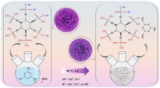 Metal-containing smoke suppression agents are widely used to reduce smoke emissions by improving flame retardancy during the condensation phase []. Phytic acid can form insoluble complexes (phytates) with metal ions, thus building an effective flame retardant barrier inside wood and enhancing its fire resistance []. Monometallic doping is widely used owing to its low cost and simplicity. By incorporating a solution of phytic acid, magnesium ions, and tannic acid into polyvinyl chloride, Meng et al. achieved a UL-94 rating of V-0 and LOI as high as 30.3% []. However, the flame retardant effects of individual metal ions are limited. Therefore, low-cost multi-metal synergies can be leveraged to fully utilize the strengths of different metallic elements, thus complementing the advantages imparted by each metal to achieve better performance. It is important to note that melamine can cause health hazards, including nephrotoxicity, when ingested in large amounts. Zinc and iron, although essential nutrients, can also be toxic when ingested in excess. Exposure risks may occur during synthesis, processing or degradation, so proper handling protocols, protective equipment and safety guidelines during production and application are essential to mitigate potential hazards.