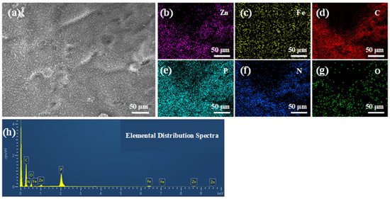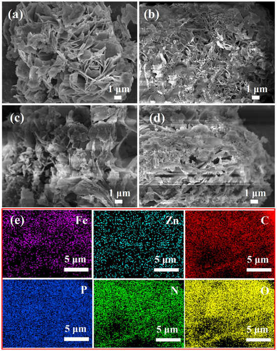 The morphology of the flame retardants, as determined by SEM, is illustrated in Figure 3. PM, FePM, ZnPM, and BPM were stacked in fluffy nanosheets, which is conducive for dispersion in organic solvents or polymers. As shown in Figure 3b, white particles were observed on the surface of FePM, which may be due to the enrichment of Fe ions on the material surface or the formation of iron phosphates and other compounds. Figure 3c shows that the flaky structure of ZnPM is relatively rough, which may be due to Zn doping, which changes the crystallinity of the material and promotes crystal growth along specific orientations, consistent with the XRD results. Figure 3d shows that the layered structure of BPM was porous with the presence of a few particles on the surface. This dispersion may be due to the synergistic effect of Zn and Fe ions, which promote the dispersibility and stability of the layered structure of the material. The bimetallic ions may have formed new active sites between the layers or on the surface of the material, promoting delamination and uniform dispersion of the layered structure. Figure 3e presents the elemental mapping of the BPM nanosheets, which provides evidence that Zn, Fe, C, P, N, and O are evenly distributed. The uniform distribution of Zn and Fe, which are characteristic elements of BPM, further confirmed that Zn and Fe ions were successfully doped into the PM nanosheets.