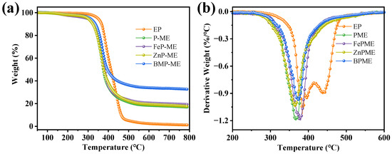 The thermal degradation behavior and thermal stability of the EP coating was characterized using thermal gravimetric analysis (TGA) in a nitrogen atmosphere. As shown in the mass-loss curves (Figure 4), the presence of fillers altered the decomposition mechanism of the EP matrix as the thermal degradation process of EP is divided into two steps. The addition of flame retardants resulted in the presence of a decomposition stage, likely due to the dehydration effect of the phosphorus-containing segments that accelerated the rate of degradation, thus forming a protective char []. The thermal stability curves and key parameters of the PME, FePME, ZnPME, and BPME flame retardant coatings are listed in Table 1. From Figure 4a, it is observed that the initial decomposition temperature (Td5%) of the EP composite material decreased to a varying extent after the addition of flame retardants. Similarly, the maximum degradation temperature (Tmax) of T5% of PME, FePME, ZnPME, and BPME decreased to 299.9, 294.4, 298.3, and 309.0 °C, respectively, which corresponds to approximately a 13.9%, 15.5%, 14.4%, and 11.3% decrease, respectively. The peak temperature (Tmax) also decreased by approximately 4.3%, 0.9%, 4.7%, and 3.0%, respectively, owing to the catalytic effect of the phosphorus-containing degradation products of the flame retardants on the decomposition of the EP matrix []. Compared to pure EP, the char residue (CR) from PME, FePME, ZnPME, and BPME increased by approximately 12.0%, 13.8%, 12.5%, and 24.2%, respectively, and did not show significant changes after 500 °C, indicating that the flame retardants formed a protective char layer during the combustion process of the epoxy resin composite system, and that this char layer exhibited good thermal stability in the high-temperature region []. In particular, the presence of bimetallic ions in BPME resulted in the production of more residue. With the addition of flame retardants, the maximum rate of thermal decomposition increased, suggesting that the combination of phosphorus in phytic acid with Zn and Fe ions may form complexes with stronger catalytic effects. These complexes can effectively promote the carbonization and dehydration reactions of epoxy resins at high temperatures, thereby accelerating their decomposition rate []. Furthermore, the catalytic characteristics of Fe and Zn promoted the initial degradation of the composite material and catalyzed char production.