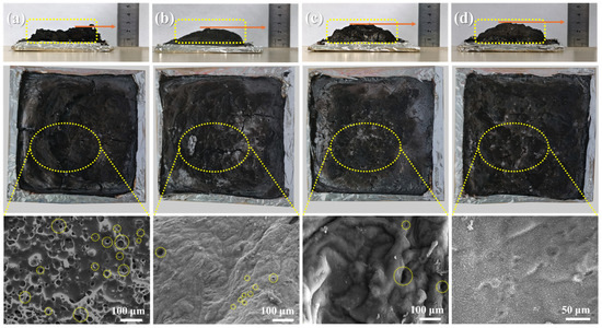 A cone calorimeter was employed to assess the process of char formation for the EP matrices with varying metal ions incorporated, whereas a detailed investigation of the morphology and composition of the char residues was conducted using SEM. These analyses aimed to elucidate the specific influence of Zn and Fe ions on the process of char formation of the EP matrix. Figure 6 displays digital photographs and SEM images of the char residues from PME-W, FePME-W, ZnPME-W, and BPME-W, evidencing a significant difference in char morphology compared to the original EP-W without added flame retardants []. As depicted in Figure S1, following the cone calorimeter test, the pristine EP-W had nearly entirely combusted and the remaining char was fragmented and porous, which was not conducive to forming an effective insulating barrier. The inability to form a barrier hinders the effective prevention of the transfer of combustible volatiles and heat from the condensed phase to the flame zone. In the case of PME-W (Figure 6a), the char thickened and increased in mass; however, the surface still exhibited numerous pores, indicating that at high temperatures, phytic acid melamine decomposes to form phosphorus-containing acidic substances, which can catalyze the formation of a char layer to some extent. For FePME-W (Figure 6b) and ZnPME-W (Figure 6c), the char surface possessed a reduced number of small pores, appearing dense and intact overall. This indicates that the incorporation of metal ions improves the structure of the char layer, thereby enhancing its smoke suppression properties. Notably, the char layer of ZnPME-W was thicker than that of FePME-W, indicating that Zn ions played a more significant role in the char formation process (consistent with the TGA results). As shown in Figure 6d, the synergistic effect of the Zn and Fe bimetallic ions in BPME-W further enhanced the compactness and integrity of the char layer, which was more conducive to suppressing heat release and smoke production. This synergistic effect may be due to the different mechanisms by which the various metal ions contribute to char formation and flame retardation, including free radical scavenging, catalyzing char formation, and improving the physical structure of the char layer.